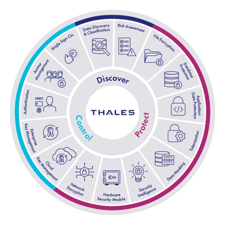 Thales, veri güvenliği, şifreleme, donanım güvenlik modülleri (HSM), anahtar yönetimi, kimlik ve erişim yönetimi, bulut veri koruma ve güvenlik operasyonları dahil olmak üzere uçtan uca siber güvenlik çözümleri sunar.